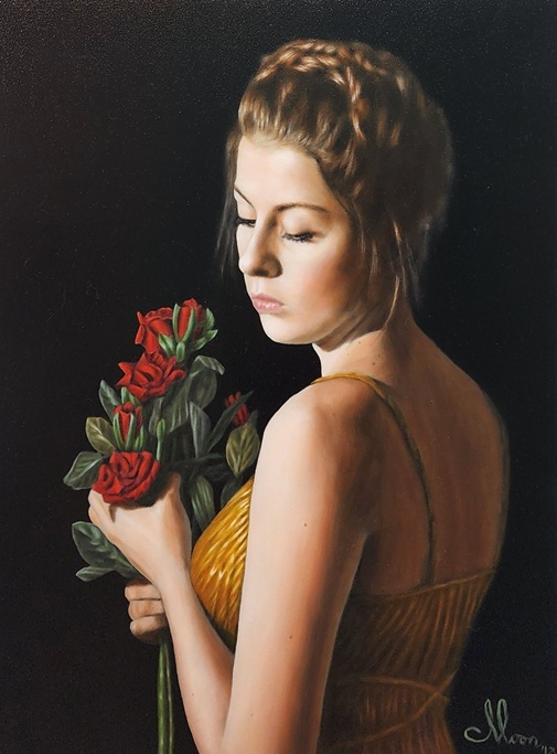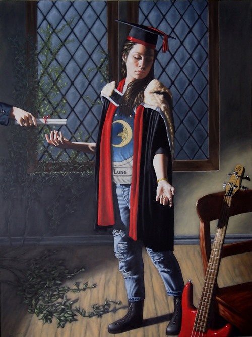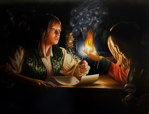 Painting mainly in oil and acrylic, Andrew is inspired by the realist styles and techniques of a range of Old Masters. He enjoys working with an emphasis on the harsh lighting contrasts of chiaroscuro (exaggerated contrasts of light and dark). Finding inspiration in the works of 17th Century masters such as Caravaggio, Velazquez and Rembrandt, Andrew’s intensely illuminated figures are picked out from their shadowy backgrounds by bold, directional sources of light.
