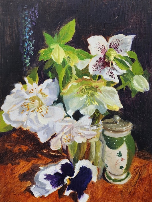 "I started painting flowers a few years ago. More recently, the flowers in my paintings are foraged, either from my own garden, a neighbour's, my mum’s, along the side of the road, in a ditch, or some other random spot."