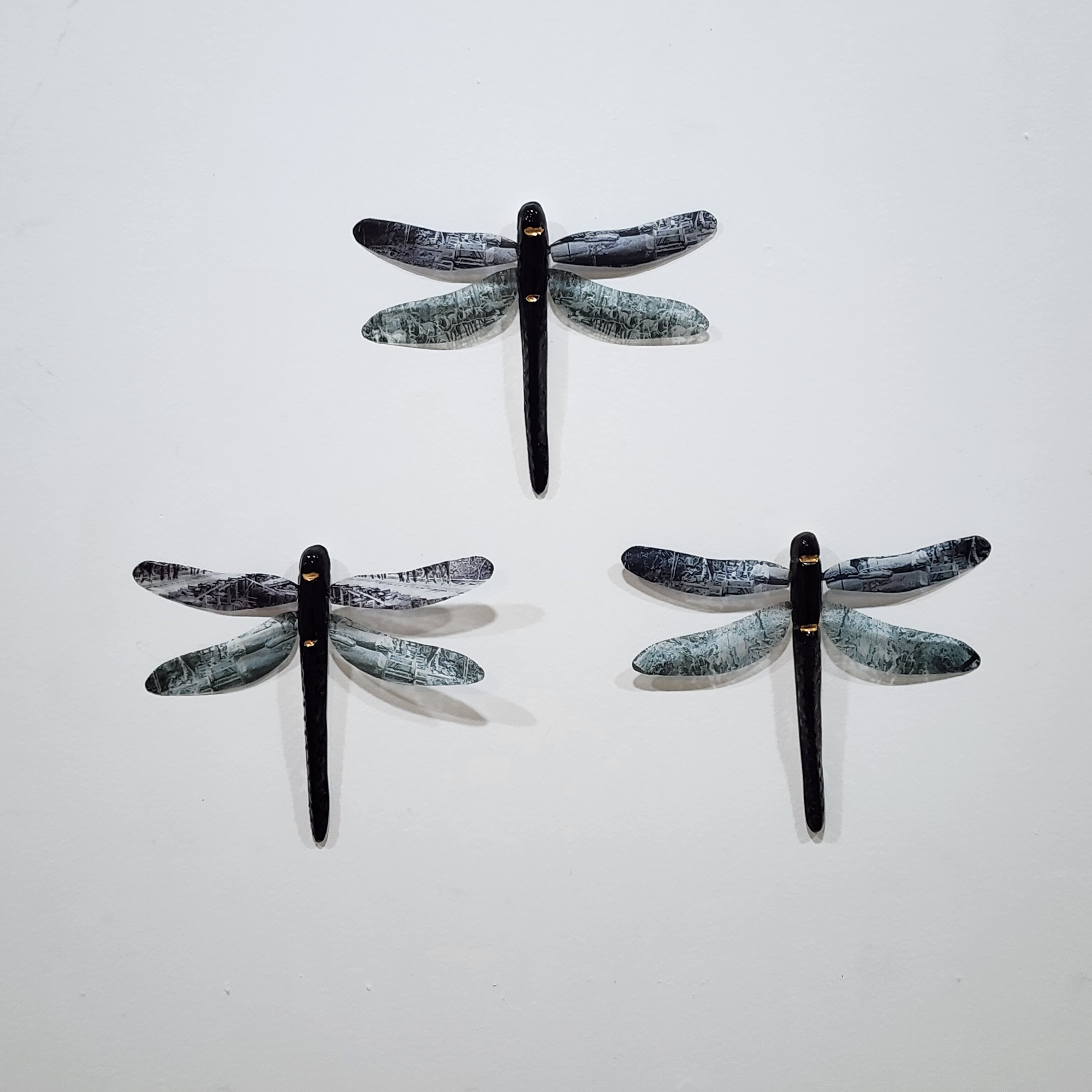 - Black and gold dragonflies (wall mounted), ceramic and mixed media with gold lustre, each approx 140 x 170 mm