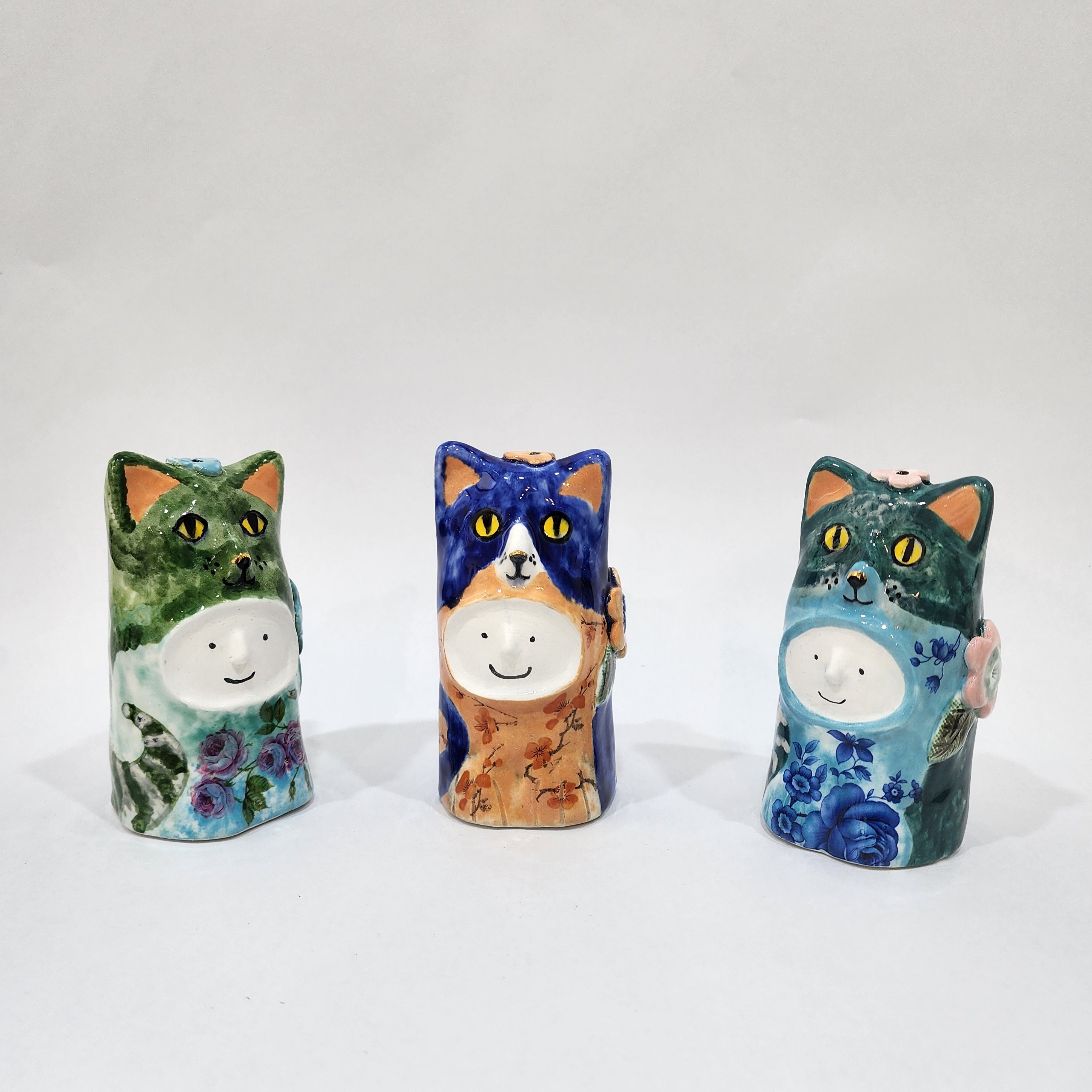 - Cat Onesies, earthenware with gold lustre, each approx 110 x 55 x 55 mm