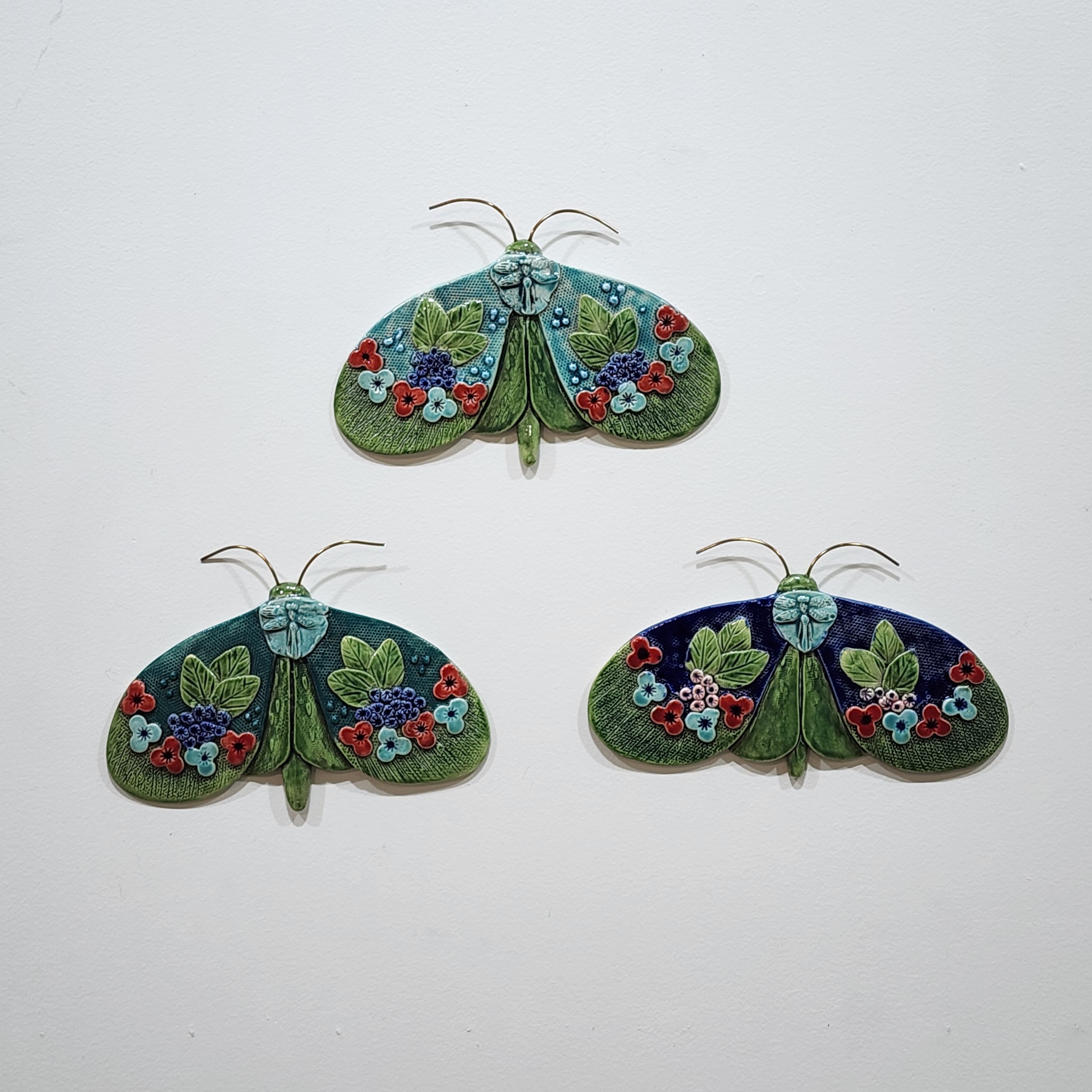 - Satin Moths (wall mounted), earthenware and mixed media, each approx 120 x 180 mm